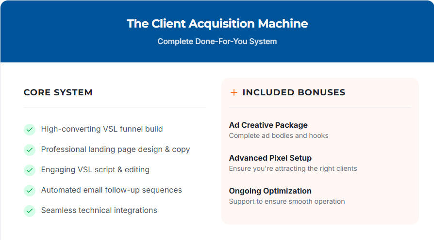 That's why we created the Client Acquisition Machine. It's a complete, done-for-you system that turns cold traffic into a consistent flow of sales-ready appointments. We build the entire machine for you, from the high-converting VSL to the automated follow-up sequences.